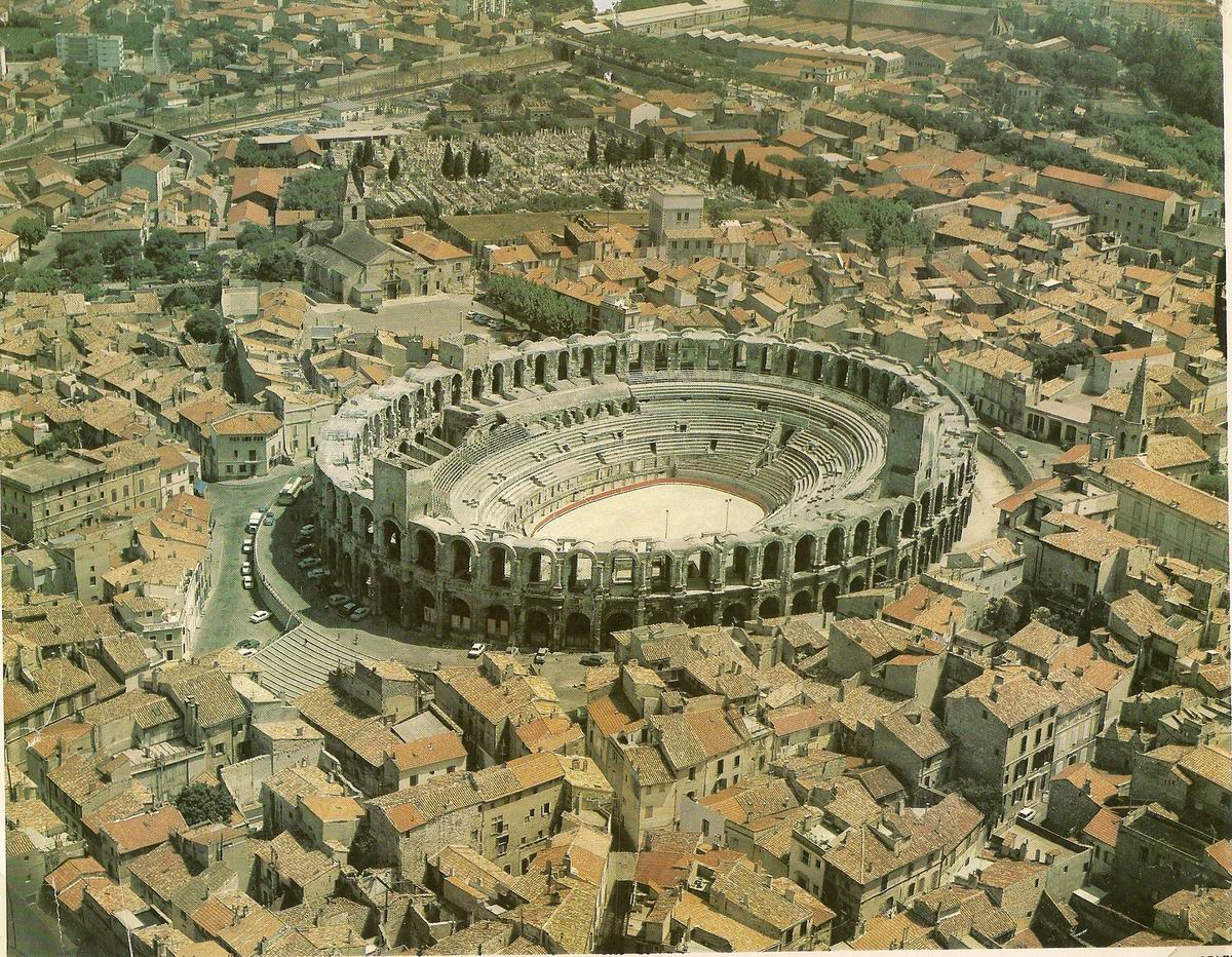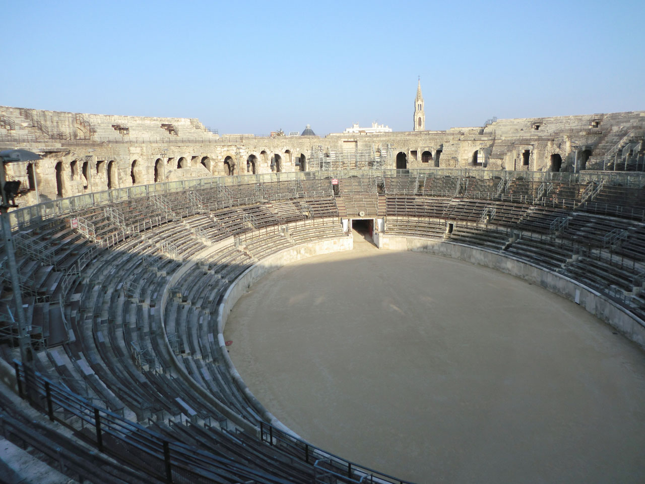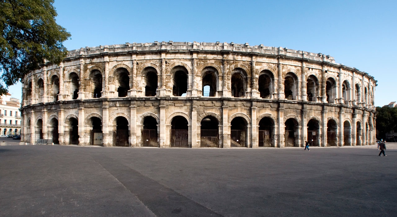 El Anfiteatro de Nîmes fue construido a finales del siglo I d. C. A lo largo de la historia el anfiteatro sufrió numerosas reformas interiores ya que los vizcondes de Nîmes construyeron su palacio-fortaleza dentro del anfiteatro. Posteriormente un pequeño barrio fue erigido en su interior, el cual contaba con unas cien viviendas y dos capillas. Estas edificaciones permanecieron hasta el siglo XVIII en que se decidió eliminarlas para devolverle el aspecto original. Está considerado el anfiteatro mejor conservado del mundo. Edificado en el año 27 a. C, Tiene un ruedo elíptico de 133 m de largo y 101 m de ancho. Está rodeado por 34 gradas, sustentadas por una construcción abovedada.